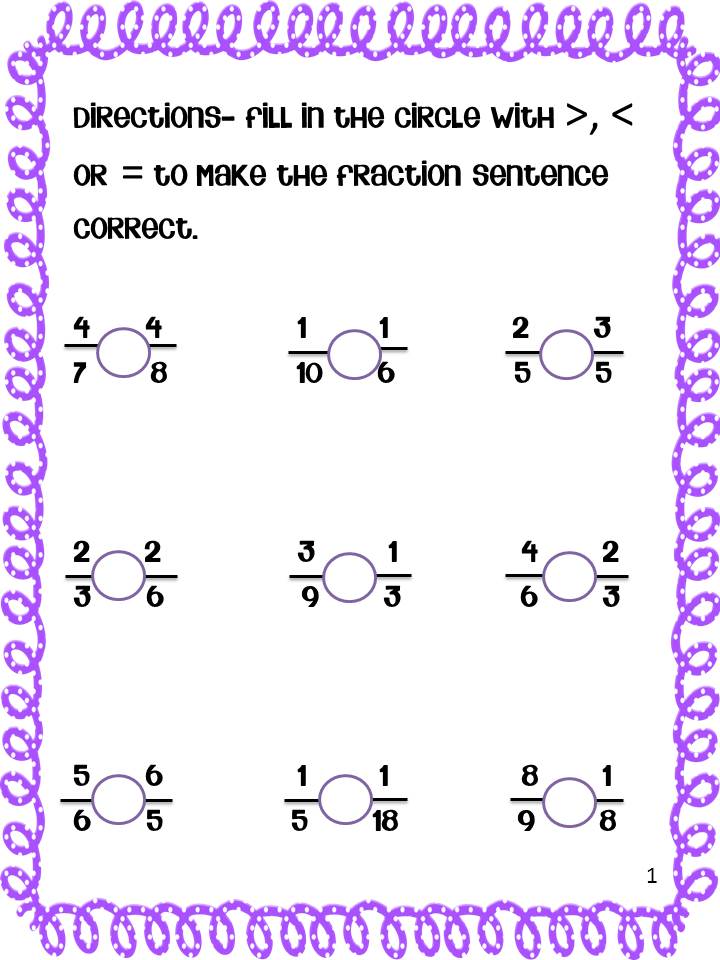 I just posted a Comparing Fractions freebie - your students will be using the greater than, less than, and equal to signs with different fractions. My kiddos definitely need a little work with these so I figured I would post 2 printable worksheets about this topic. Fonts from Kevin and Amanda, and the best borders from The 3AM Teacher :] My girl!